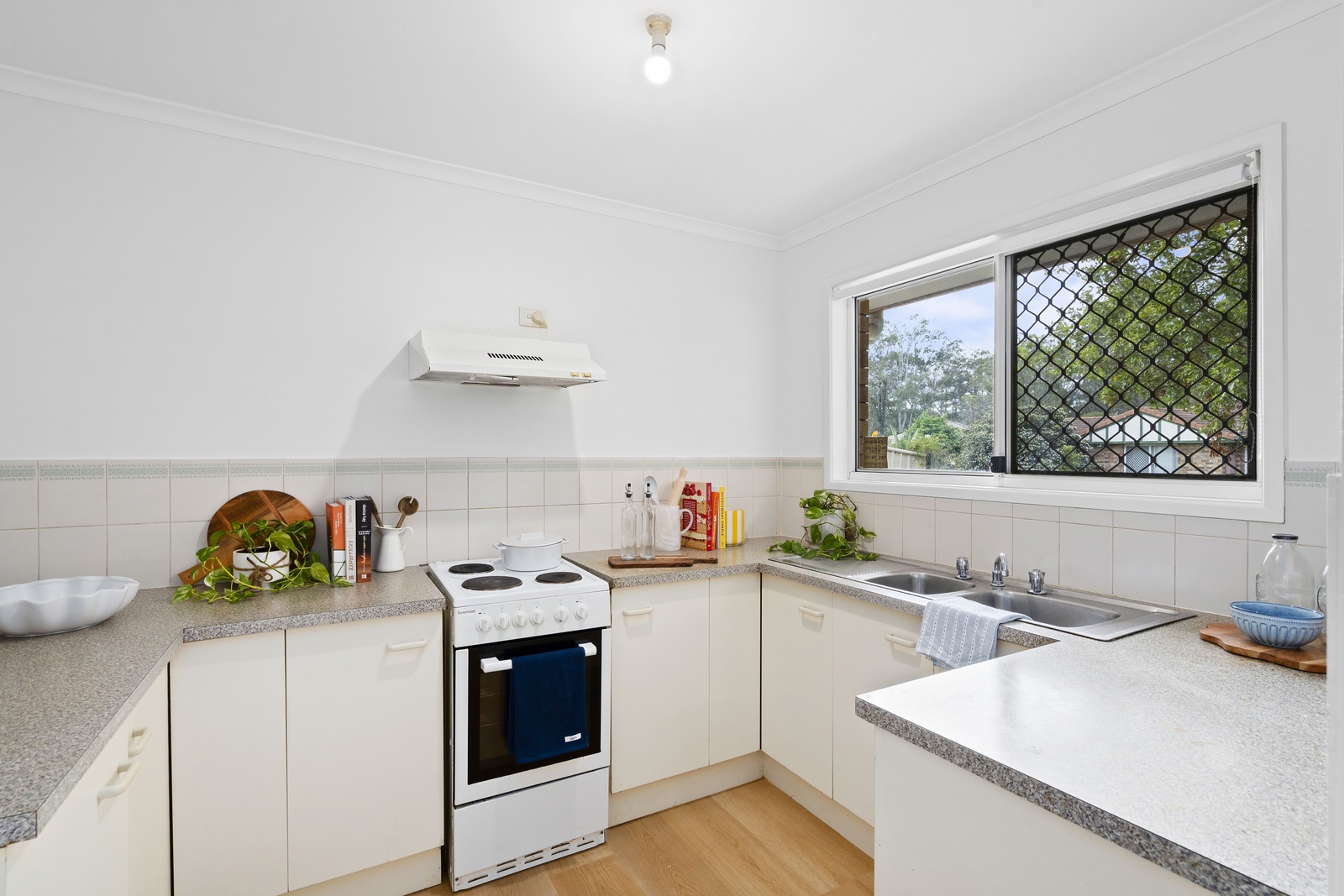 Step into the light-filled open-plan living and dining area, an ideal space for family get-togethers and entertaining guests. The kitchen is sure to impress, equipped with ample storage, a stovetop, oven, overhead range hood, and a double sink that offers a view of the front yard and outdoor entertainment area.