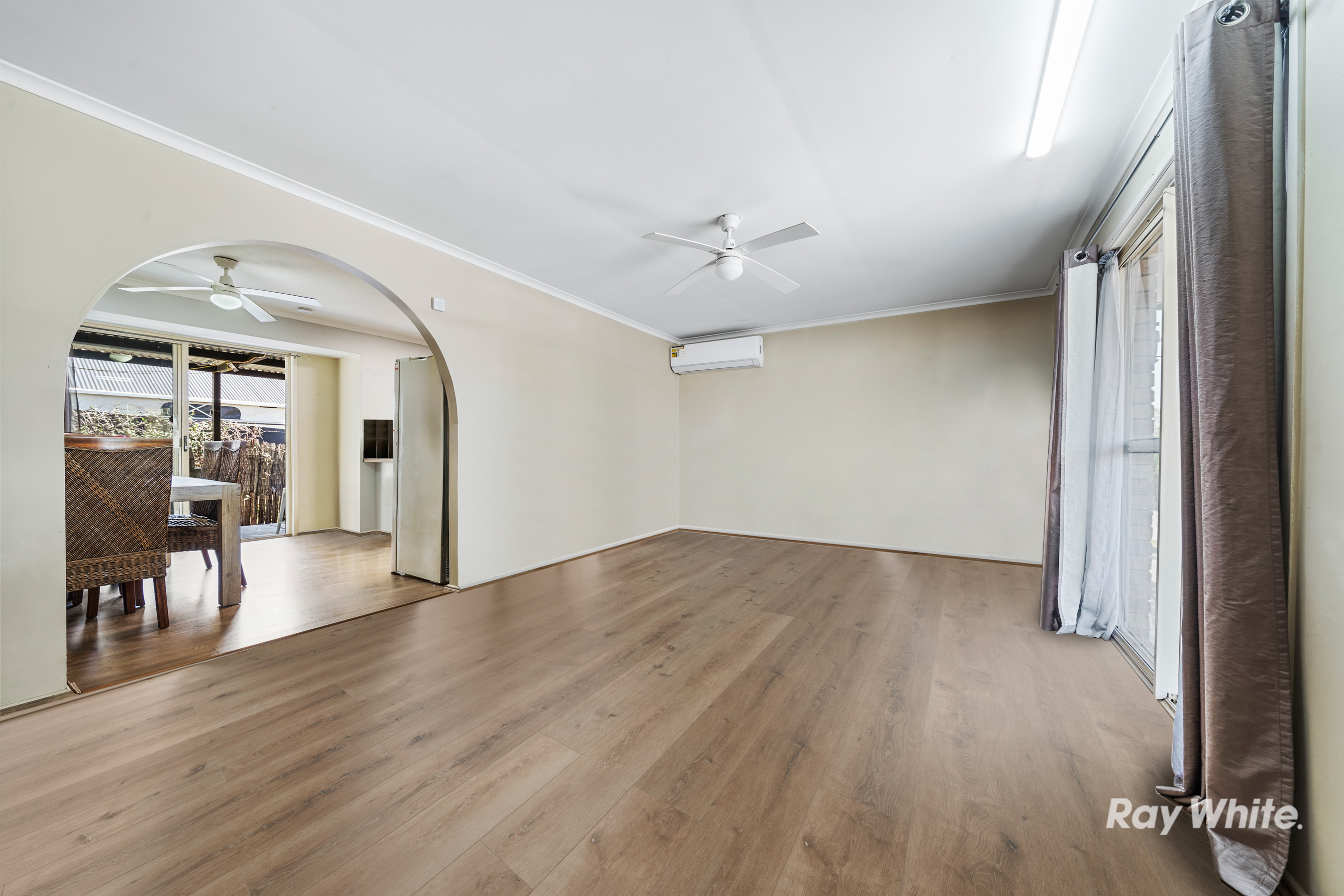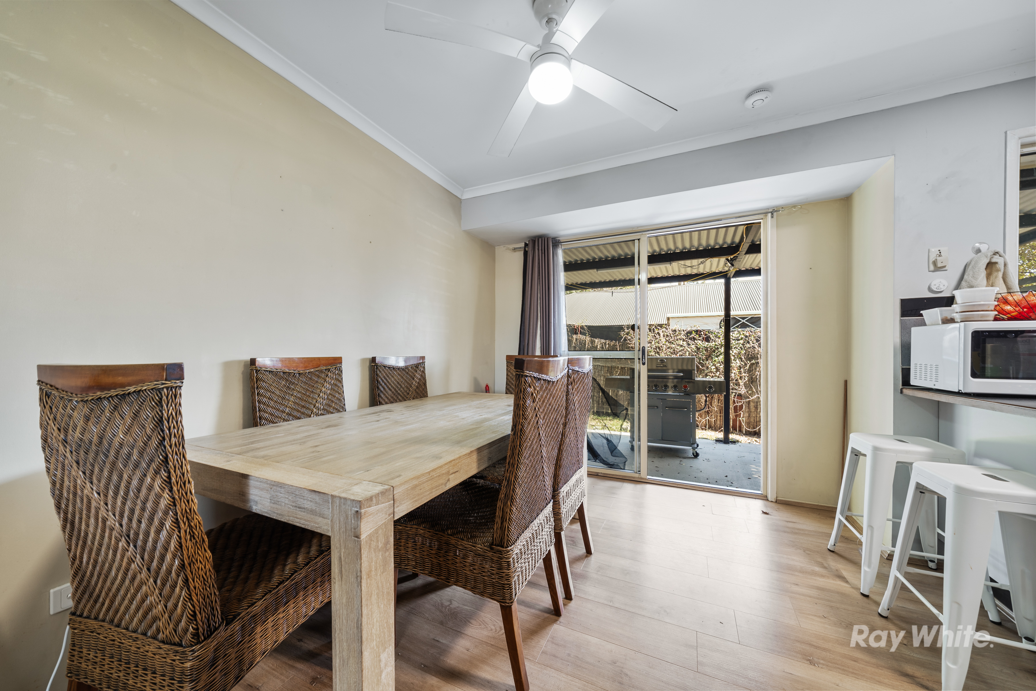 Before entering, you will find a front porch spanning the full length of the home and is ideal for enjoying your morning cuppa or supervising the kids play in the yard! Enter into a generous living area complimented by natural light and air-conditioning for comfort. Through the archway is the comfortable dining area with ceiling fan and hybrid flooring. Adjoining is a well-appointed kitchen with an electric cooktop and plenty of storage and bench space. Seamlessly connecting is a large, covered patio which is newly concreted and has a great view of the children playing in the established gardens.