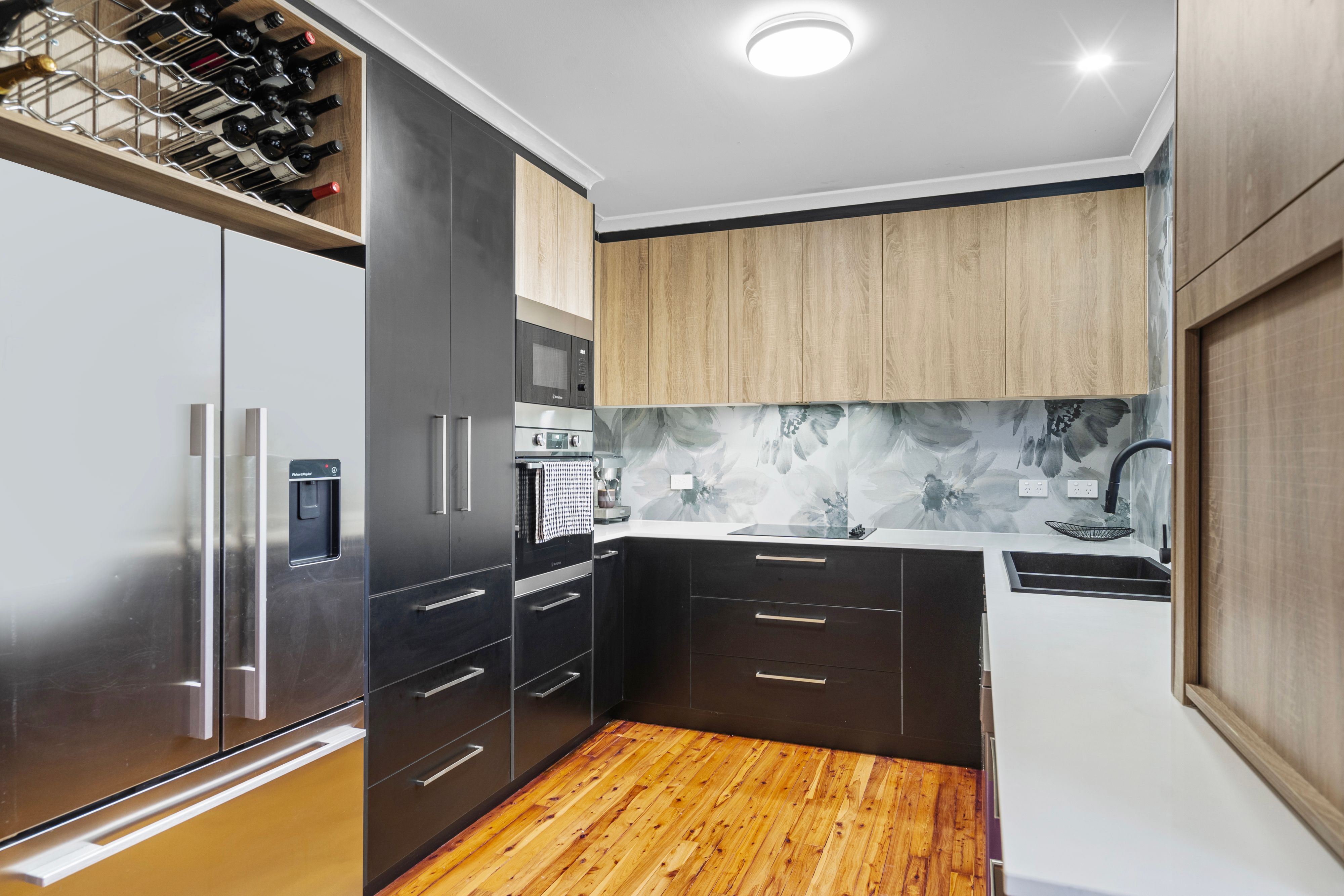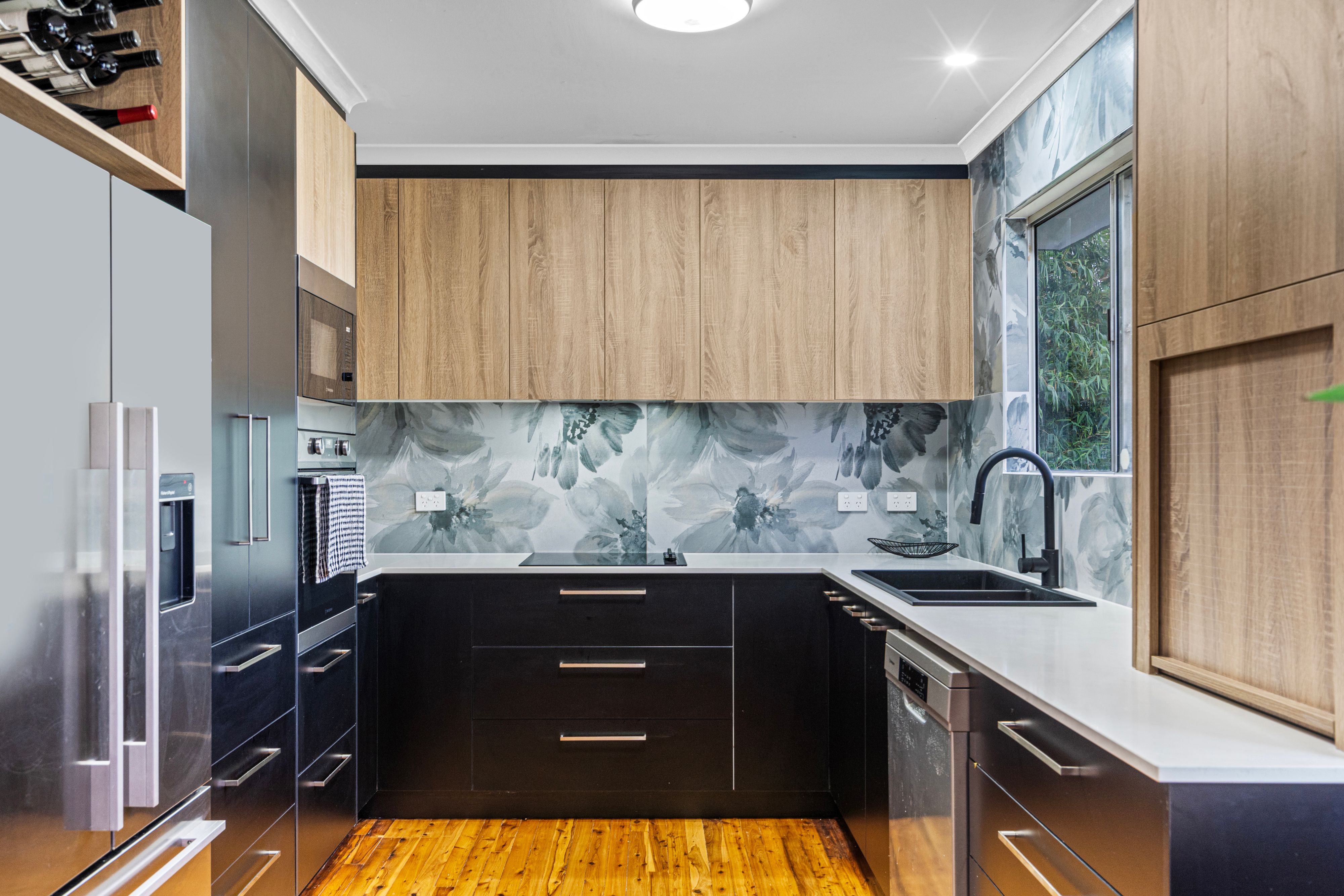 The kitchen is a true highlight, with its sleek design and high-end finishes. You'll find dark cabinetry paired with light timber accents and a stunning floral backsplash that adds a touch of elegance. Modern appliances, ample storage, and a dining nook with large windows looking out to the backyard complete this stylish and functional space.