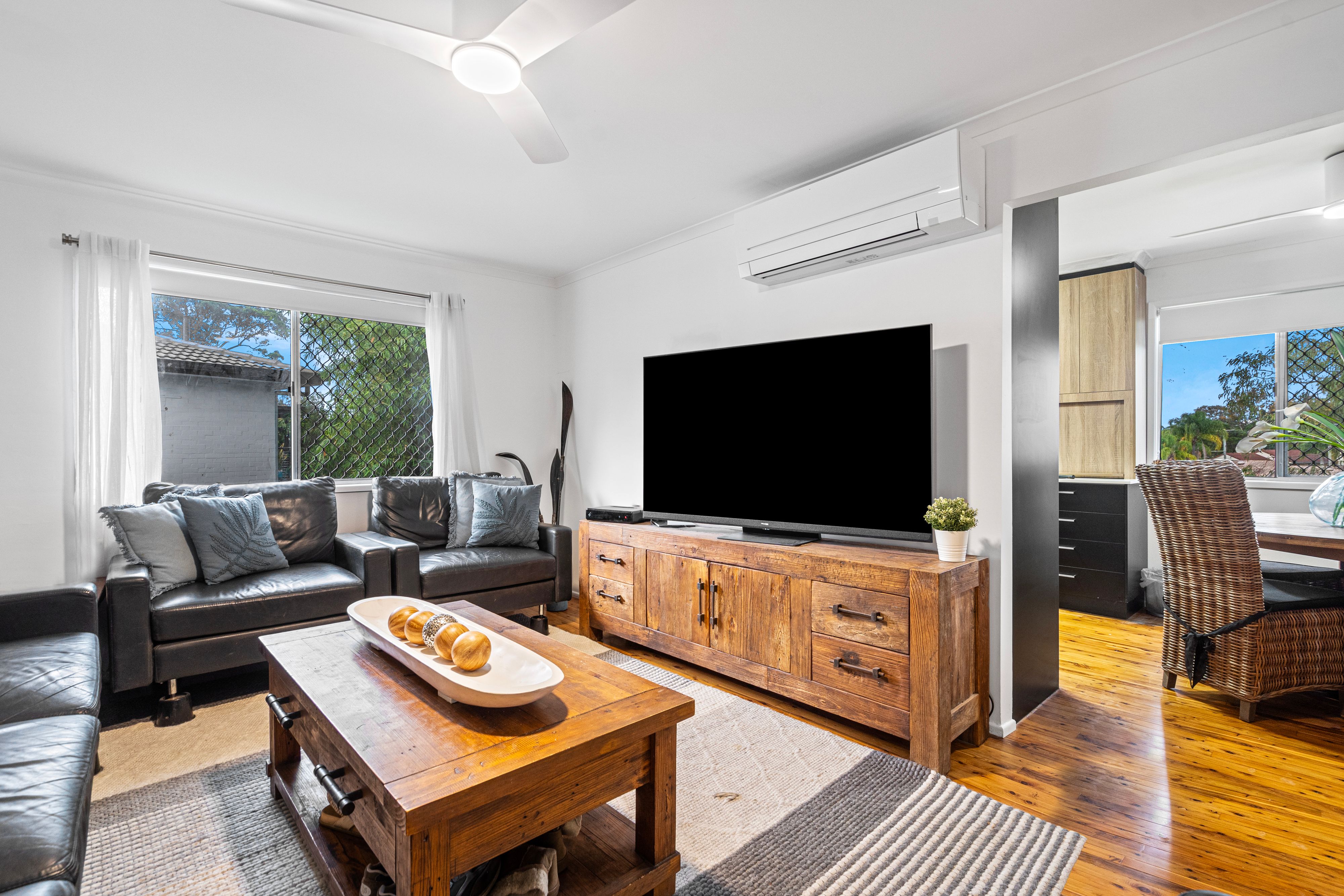 Step inside to discover the inviting living room, which features polished timber floors and an abundance of natural light from large windows. The open plan layout seamlessly connects the living space with the kitchen and dining area, making it ideal for both relaxing and entertaining. The lounge room, equipped with a modern air-conditioning unit, offers plenty of space for large furniture and media setups.